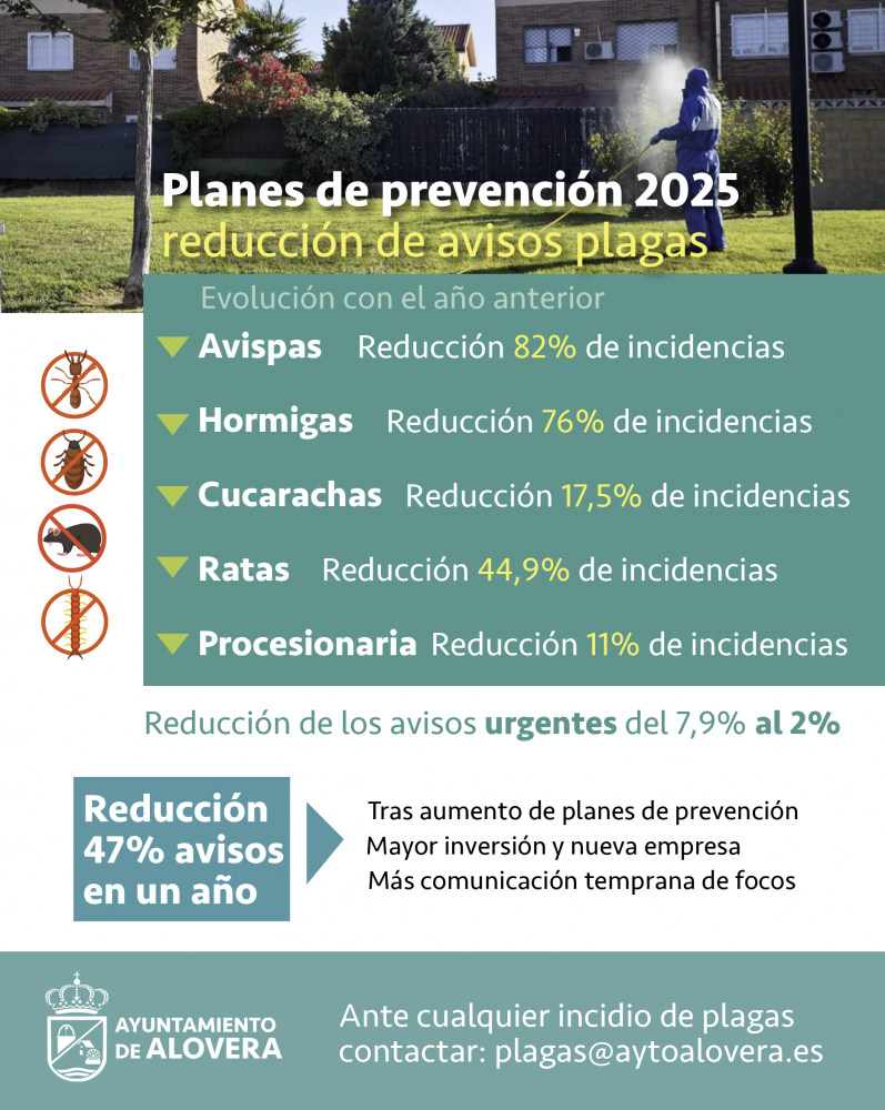 Desde el ayuntamiento el concejal responsable, Álvaro Cembellín, valora positivamente esta evolución, que consolida un modelo de control de plagas más eficiente, planificado y con menor incidencia en la vía pública. Manifestando que esta linea de trabajo refuerza una mejora sostenida en la salubridad urbana, fruto del refuerzo de los tratamientos preventivos, la planificación anual de campañas y la colaboración ciudadana en la comunicación temprana de focos.