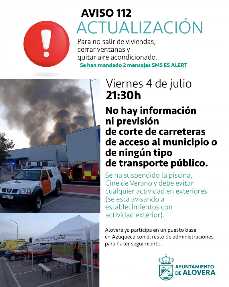 Ante la evolución del humo provocado por el incendio de una nave en el polígono industrial Ródano (Azuqueca) y, siguiendo indicaciones del cuerpo de bomberos, se mantienen las recomendaciones iniciales de cerrar puertas y ventanas, apagar los aparatos de climatización y evitar acercarse a las proximidades.