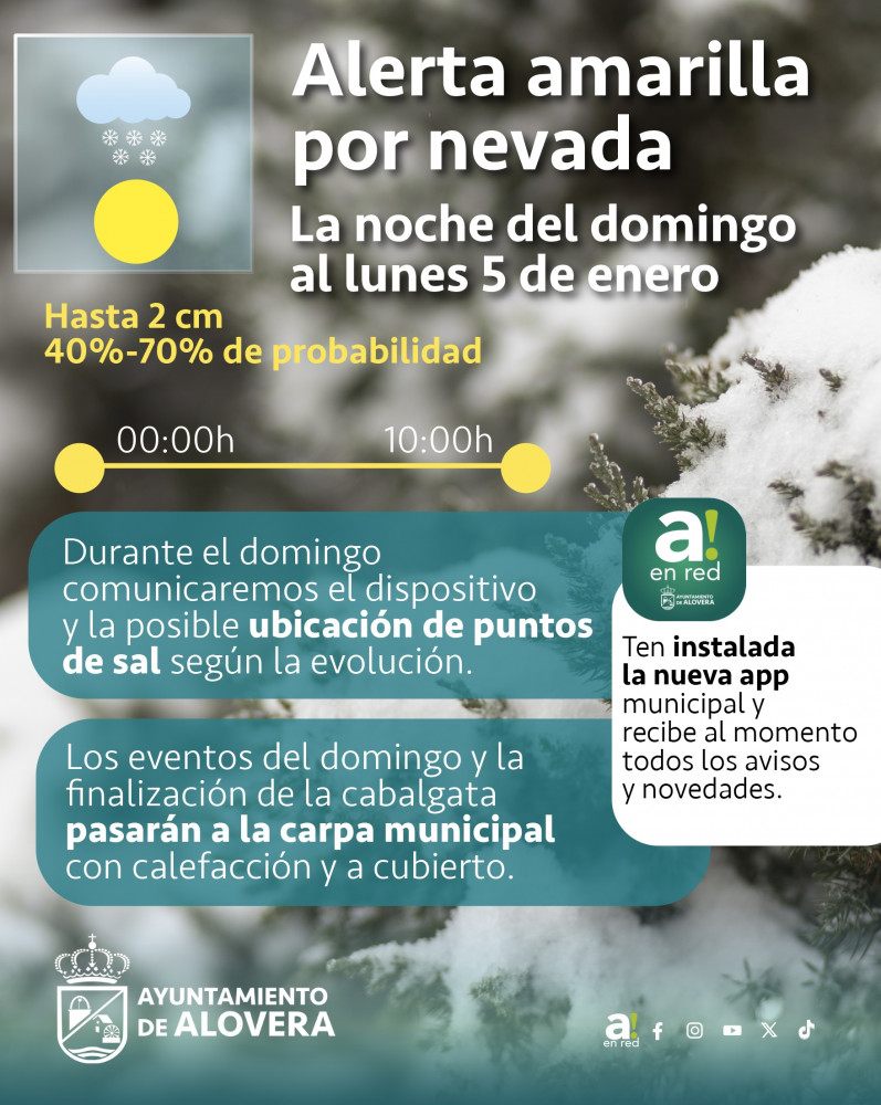 Alerta amarilla por nieve en Alovera el próximo lunes 5 de enero.