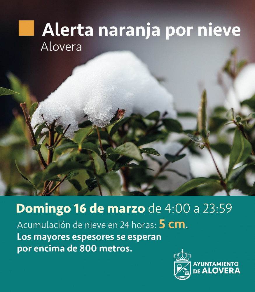 Alerta naranja por nieve este domingo AEMET ha informado que de 4 a 23:59h hay riesgo de nieve de 5 cm.
